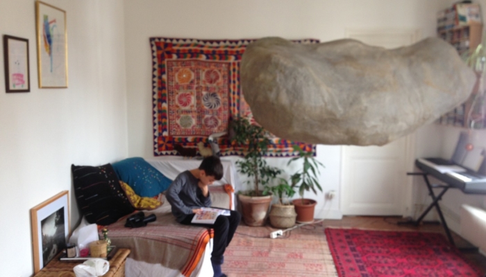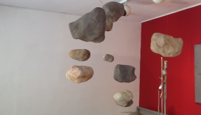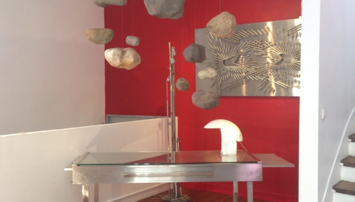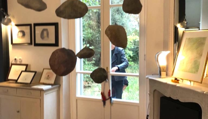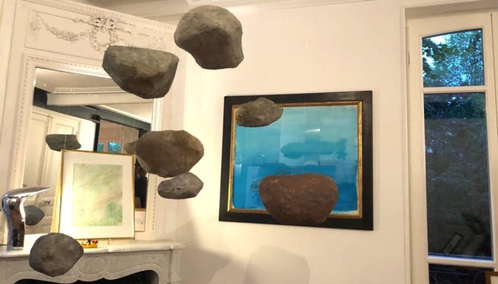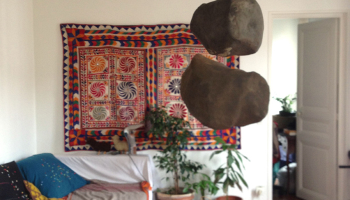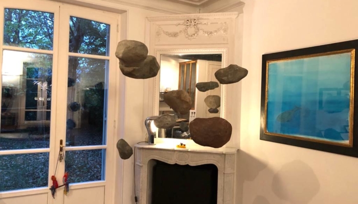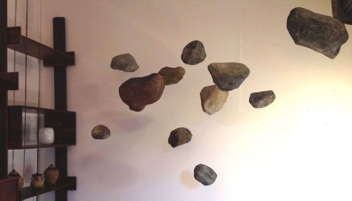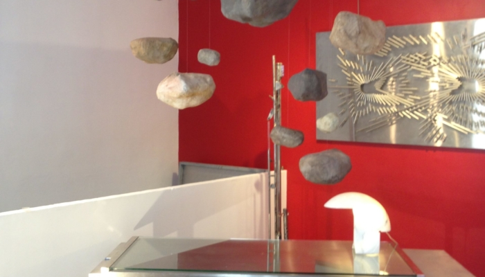 Mobile et modulable, la suspension se compose et s’adapte à volonté, en fonction du lieu et de l’environnement. Formée d’un nombre variable de cailloux, la position et la hauteur de chaque élément, accrochés par d’invisibles fils au plafond, est adaptable.